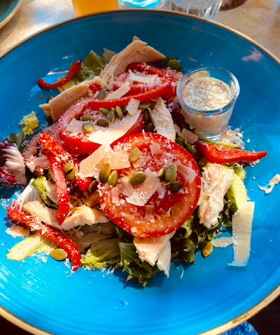Generously portioned, the salad had grated fresh parmesan sprinkled on top and a French dressing on the side, with big, juicy slices of beef tomatoes and pumpkin seeds. Personally, I would have toasted the seeds but it didn’t matter. They had a good crunch anyway. The poached chicken was moist and, unlike many chicken salads I have had, there was loads! Served in a gorgeous light blue bowl, it hit the spot.