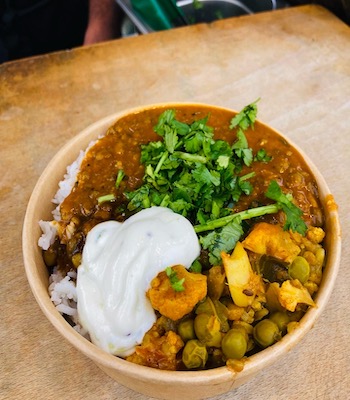 On the menu that particular sunny day was Cauliflower and Pea Curry and Mung Bean Dal. As I sat facing the throng of people, I was instantly hit by the spicy cauliflower, with each mouthful leaving a hint of ginger and an explosion of earthy peas in my mouth. Thankfully, there was a dollop of yoghurt not too far away.